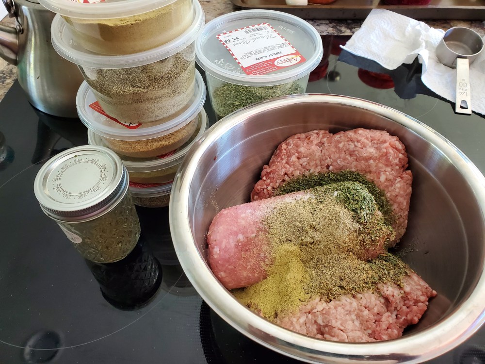 - 3 lbs ground meat (pork, beef, or bison, or combo)