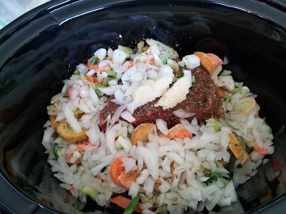 Oil bottom of slow cooker, place in the roast (rubbed with spices). Then add the water and the remaining ingredients.