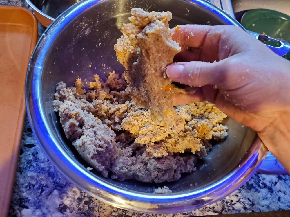 This is the consistency you want for the batter (for all cookie versions). If you squeeze a glob of it, it should hold. If too crumbly add a little more water