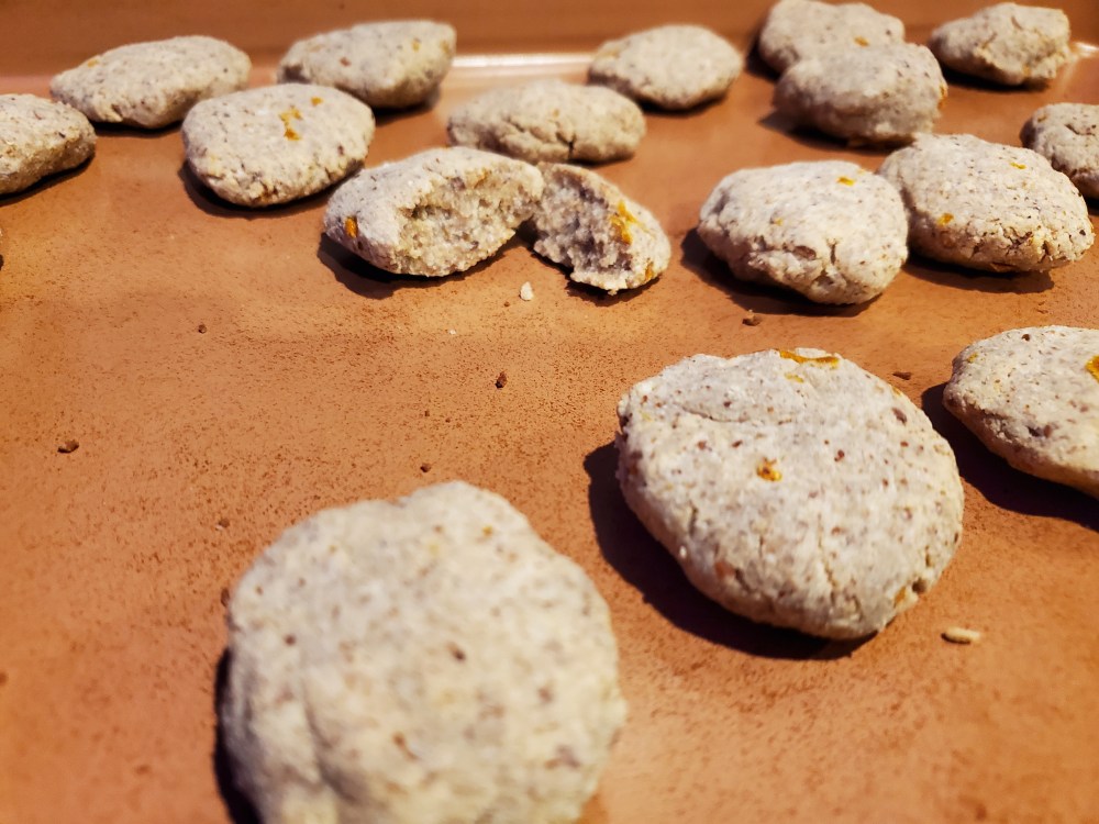 Juice the orange. Use the orange juice INSTEAD of water…topping off with some water to get to 6 TBL. Add liquid and zest. Swap out peanut butter for almond butter. Make cookies as above.