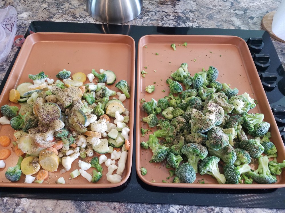Get out 2 – 3 baking sheets and place a pile of frozen vegetables on top. Fresh of course okay too – but Wellsley Farm frozen vegetables do all the work for you to make this a quick staple to keep stocked!